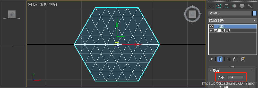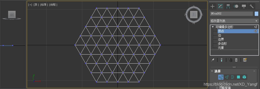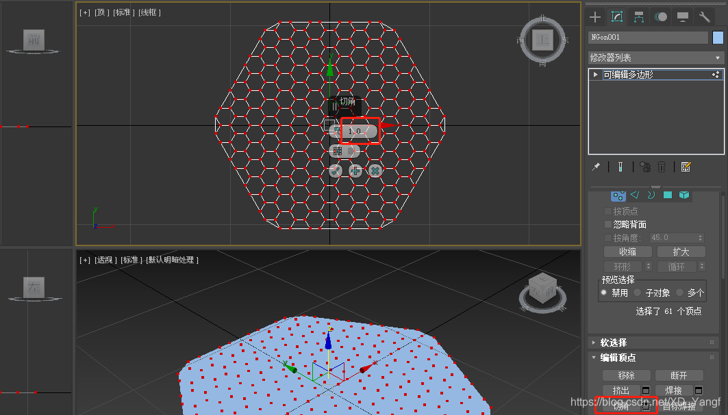 在可编辑多边形中点击顶点,并在选中视图中的模型的所有顶点,然后选择编辑顶点中的切角功能。此功能可将多边形顶点切分至更多,切分程度可调节。为了切出均等大小的六边形,这里大家需要自行调节切角数值。