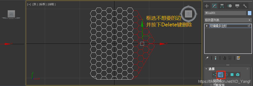 在可编辑多边形中选择边,然后在顶视图中框选不想要的边,按下Delete键即可将其删除。