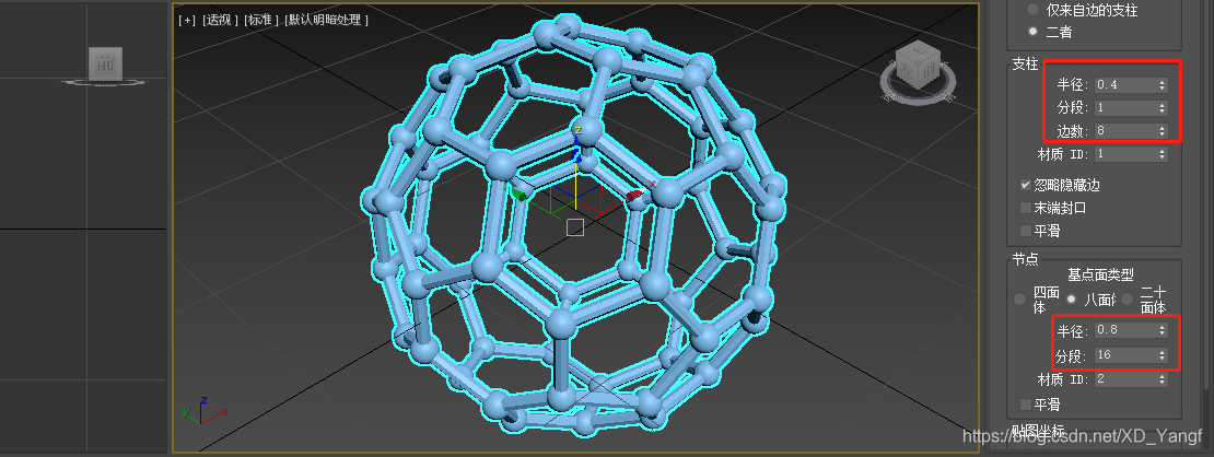 在修改器列表中添加晶格,配置如下参数,即可完成富勒烯的建模。