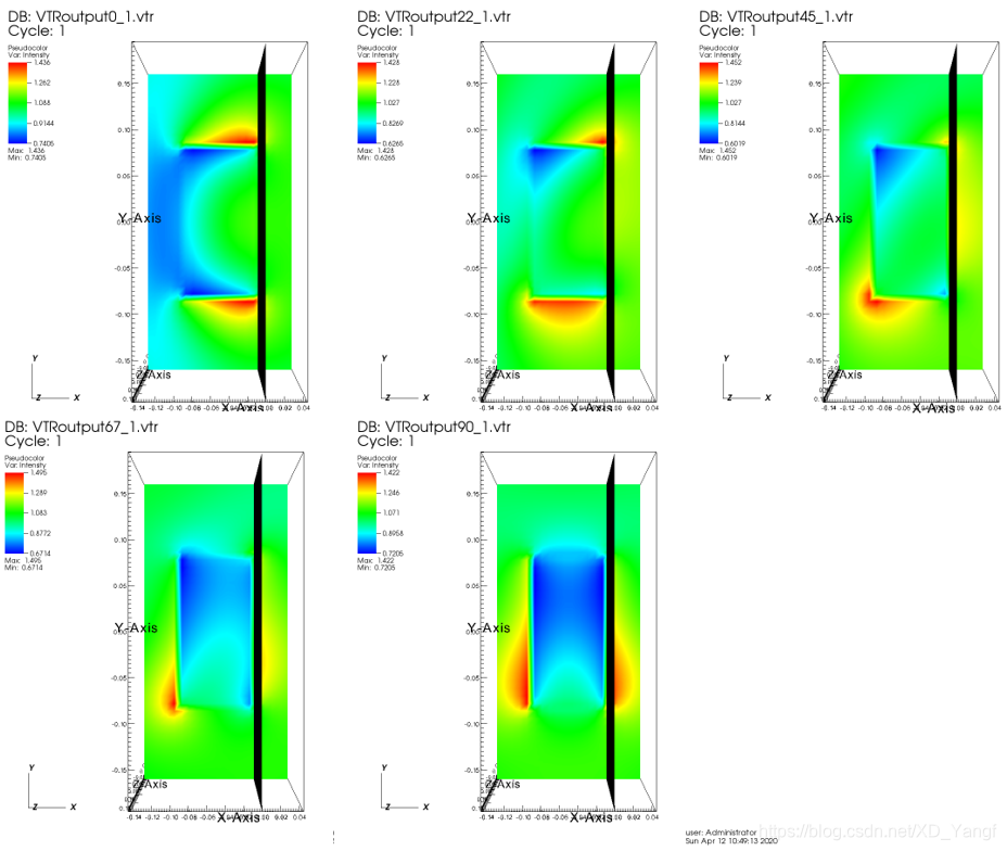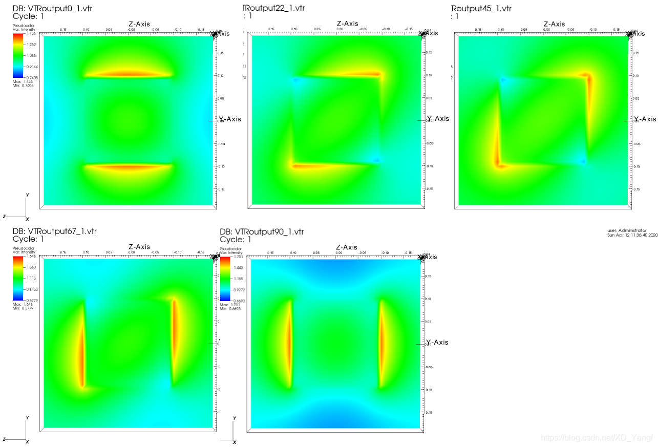 别急,我们仔细观察电场图,发现场强较强的红色黄色部分一开始是分布在模型上下两侧的。而后来,随着THETA角度的改变,场强强度分布有点变化,下强上弱。而到最后一张图的时候(THETA = 90 degree),发现,原本上下对称的场强,现在变得左右对称了。这时候,就验证了我们一开始的猜想: