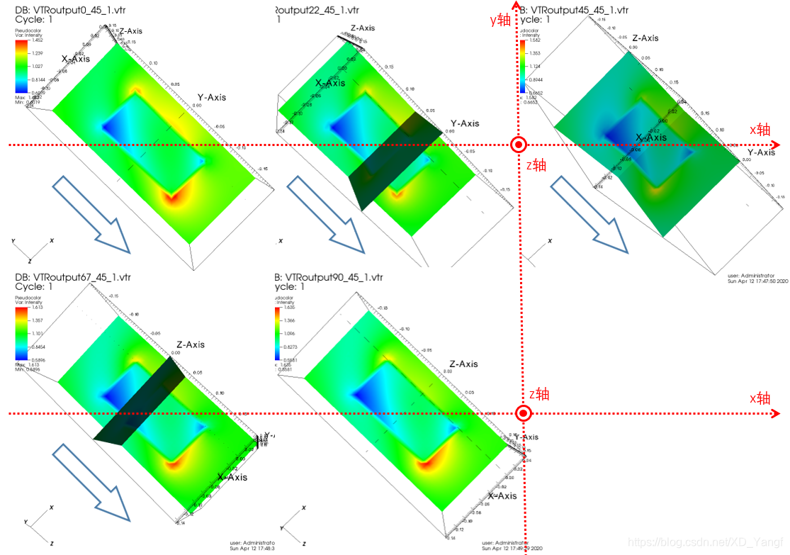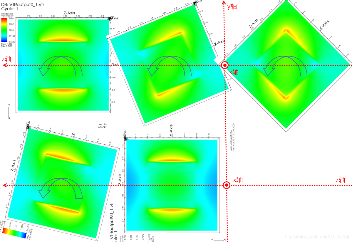 按照我们设定的THETA角度之后,手动在Vislt(本篇所有的可视化我都用了三维切面呈现)中转动模型之后,我们可以看到,此时的电场强度基本是以x、z平面上下对称的。这也就表明了,我画的这个坐标系是实际上的LF坐标系,且此时的入射光是沿我画出的x轴传播的(在这里,我们忽略Vislt图中左下角那个坐标系,不要管这个坐标方向)。
