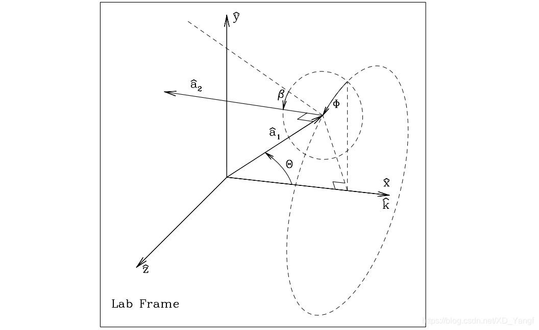 DDSCAT又定义了一个Lab架构,其中,入射光需沿x轴正方向传播。而x^LF, y^LF, z^LF = x^LF × y^LF分别为这个坐标系的三个坐标轴。这个LF,我们就理解为常见的笛卡尔坐标系,而特殊的地方就是,LF规定了入射光必须沿+x方向传播。