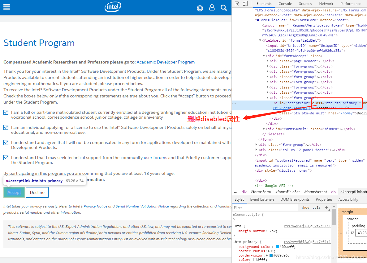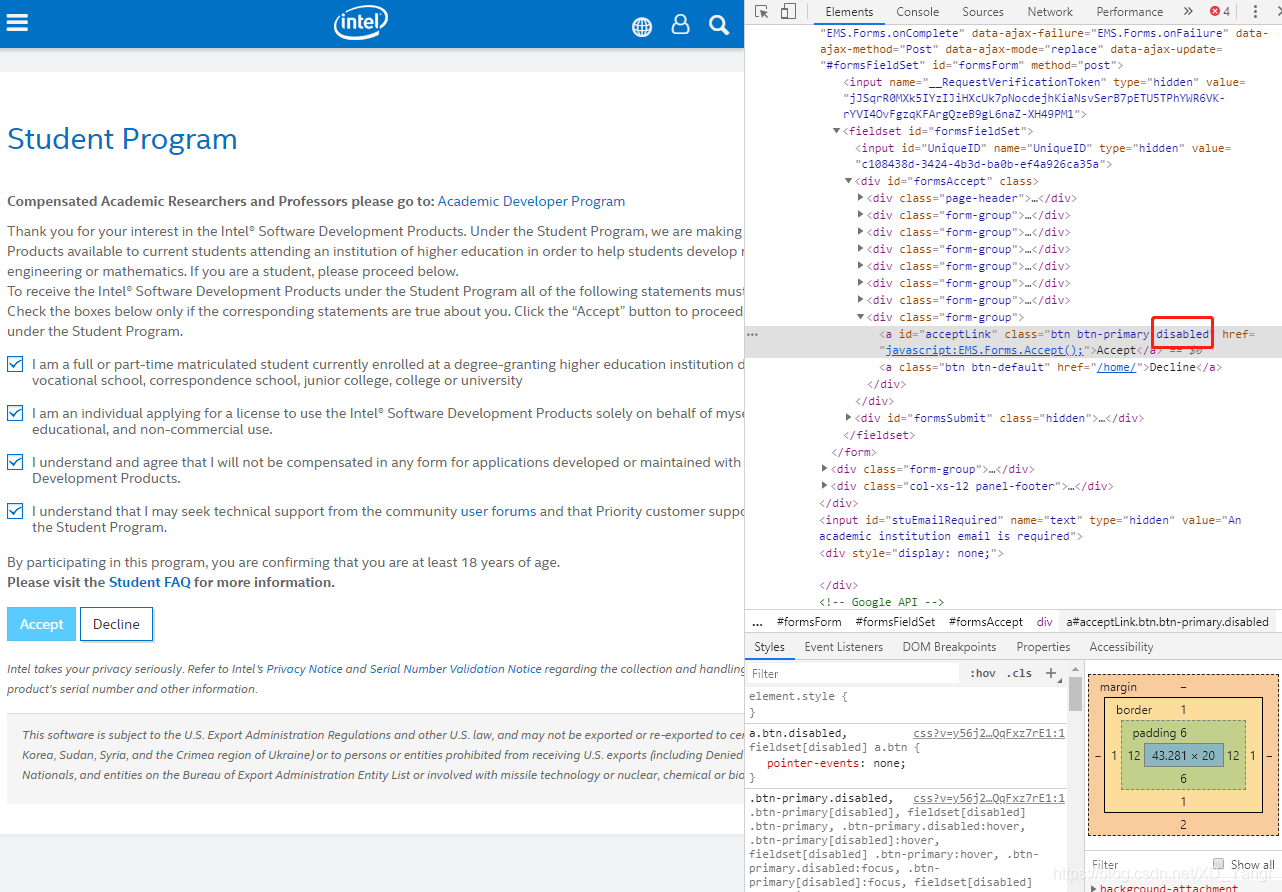 这样点击检查之后,页面信息会自动定位到Accept的位置。我们看到Accept跳转标签的class属性是disabled,说明此按钮是不可用的。