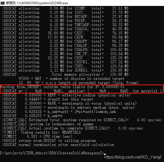 报错的原因暂时还没有找到,但是可以确定的是,其中X=3.00000D-01中的X表示的是入射光的波长。因为我改变过波长的值,这个值也会跟着改变,继续报错。小范围的波长改动依然会继续报错,但是大范围的波长改动,会导致程序一直迭代下去,不会终止,且error误差值很大。