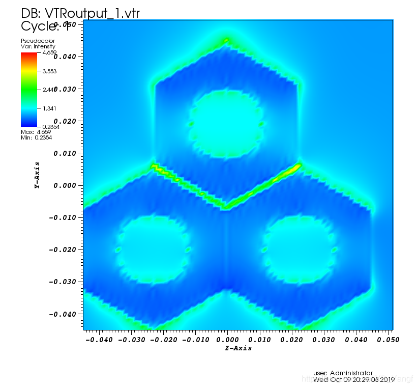 在尝试了很多次的改动之后,终于改出了可以正常运行不报错、可以可视化的配置文件。结果其实很简单,就是把介电常数的种类配置为两个。虽然这个纯六棱柱模型是由一种物质构成的,但是我们设置有两种配置文件没有什么影响,只要shape文件里面只出现1,不出现2就行。结果,这样一改,反而结果正确了。