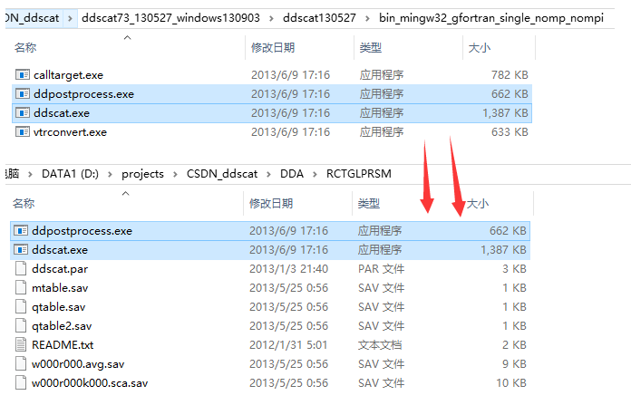 如下图,先把bin_mingw32_gfortran_single_nomp_nompi(这里我们建议选择32位的运行程序,因为64位的会有一些问题,我们后面再说)文件夹中的两个程序考到RCTGLPRSM文件夹中,然后我们看RCTGLPRSM中的文件。