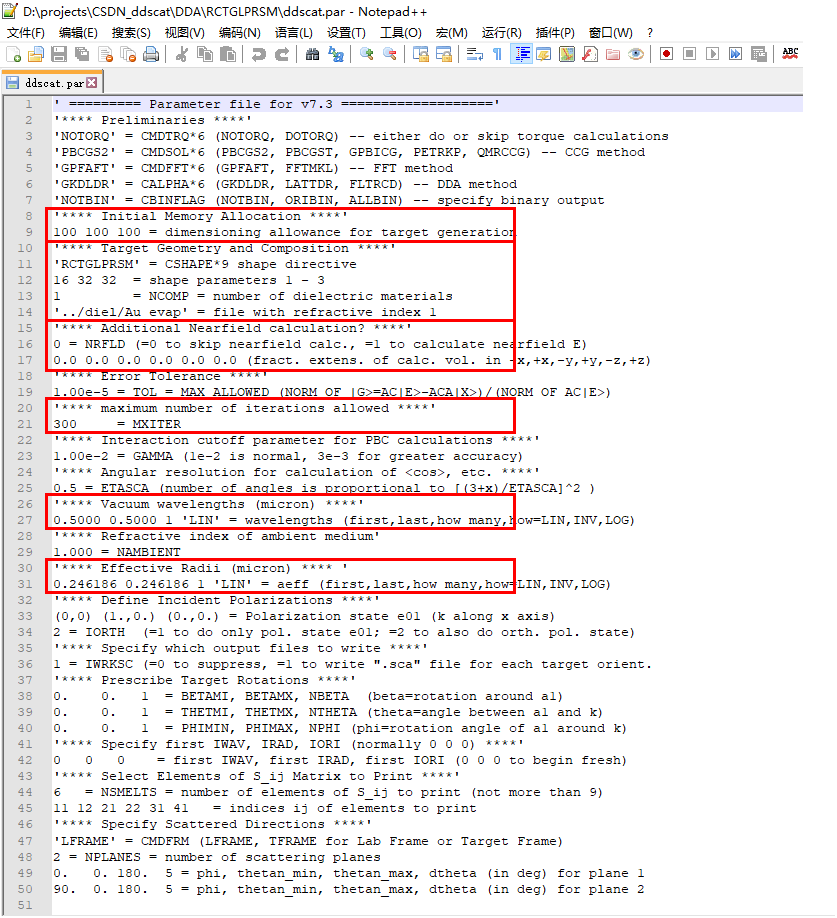 打开ddscat.par文件(使用记事本或Notepad、EditPlus等代码编辑软件打开),我们先只关注我框出来的这些参数配置,后面再解释其他的。