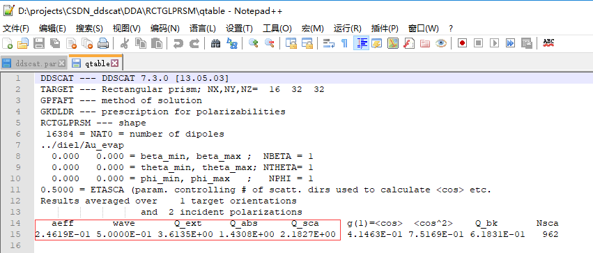 aeff表示有效半径,wave是入射波长。接下来我们主要关心三个参数,Q_ext、Q_abs和Q_sca。他们分别代表消光值、吸收值、散射值,且Q_ext=Q_abs+Q_sca。