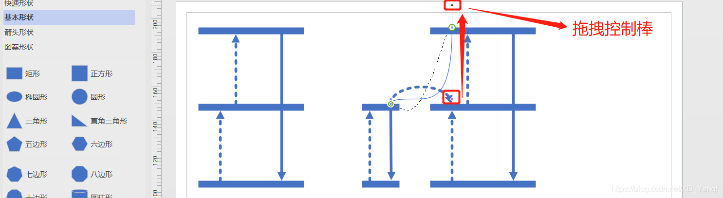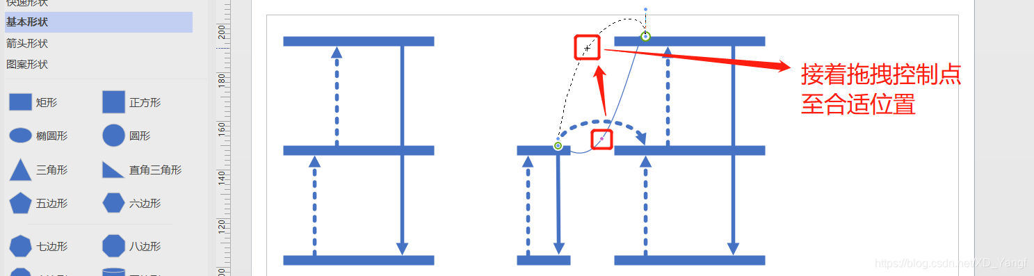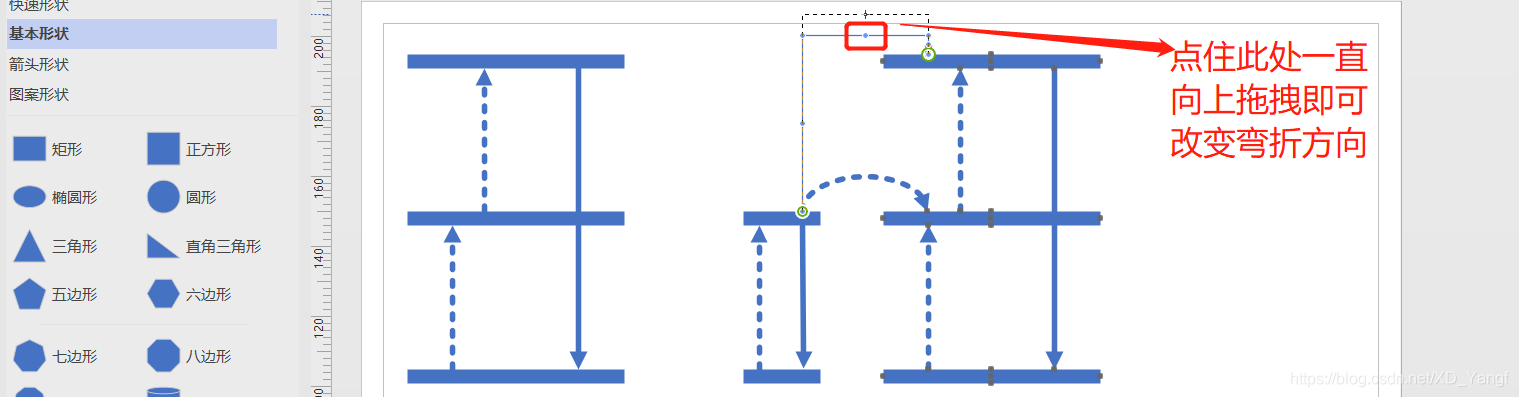 那么,需要点住折线的一个控制点,将其一直向上拖拽,即可改变直角连接线的弯折方向。