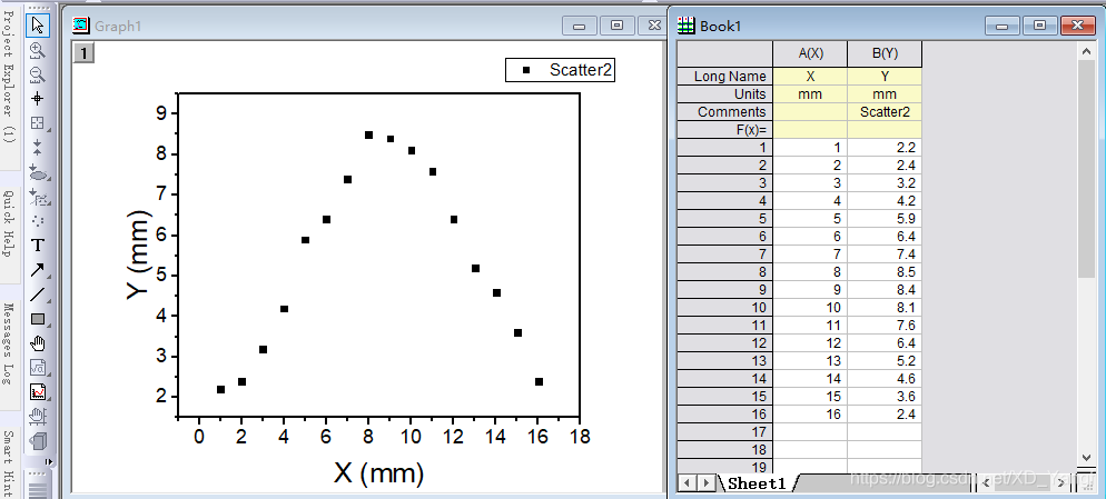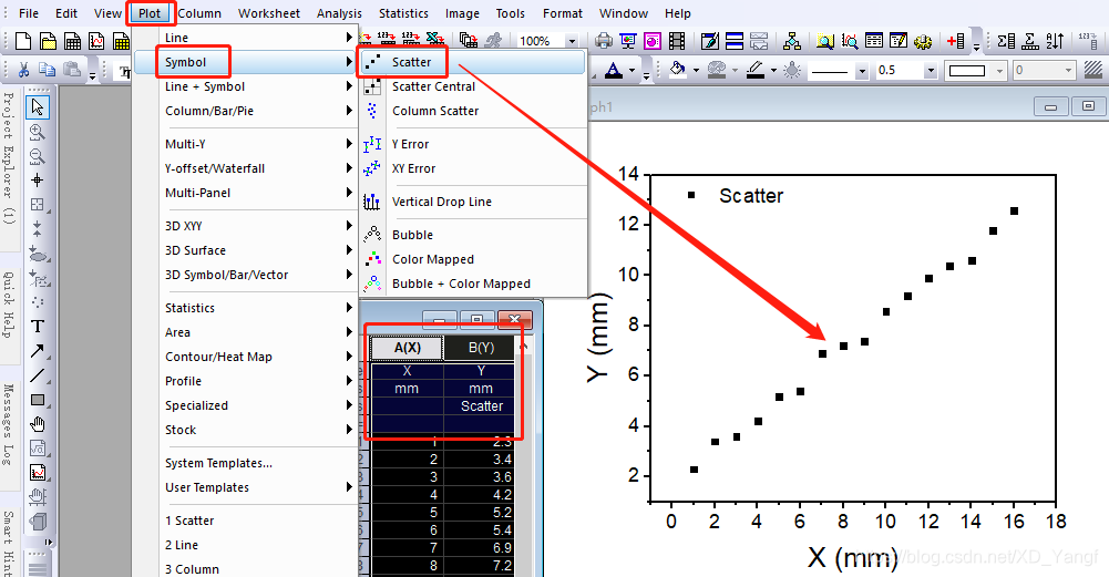 如下图所示,我们随意编了一组数据,框选X、Y两列之后,点击Plot——》Symbol——》Scatter,即可绘制散点图(下图中已经绘制完成)。