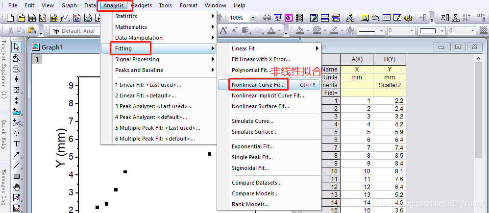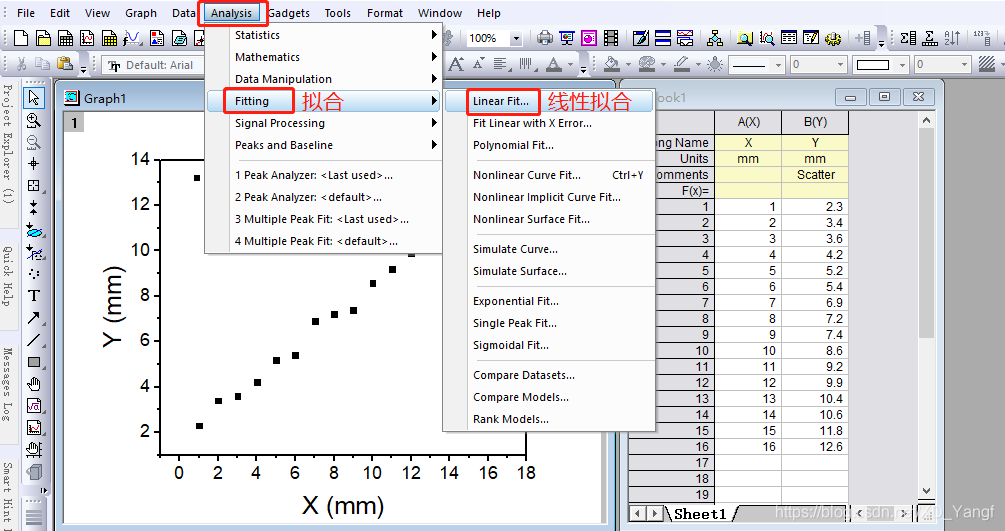 如下图所示,点击Analysis分析——》Fitting拟合——》Linear Fit...线性拟合,以打开线性拟合对话框。