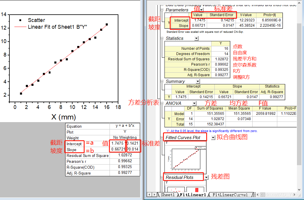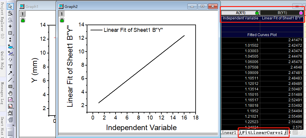 如果需要重新绘图,则可以切换到FitLinearCurve1拟合线性曲线分页,选中前两列数据绘图即可。