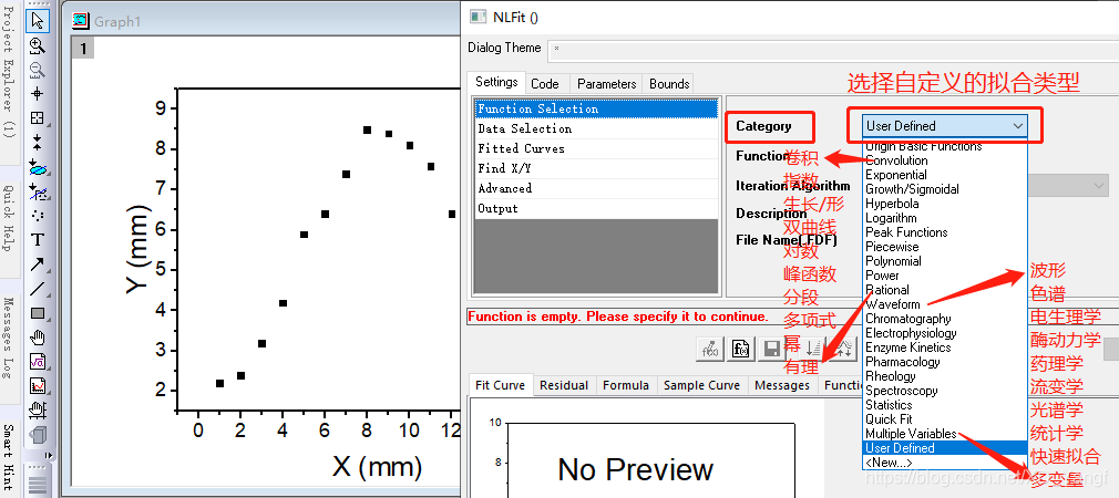 如下图所示,Origin提供了很多自带的拟合类型,同时,也可以自定义拟合类型。此时,我们选择User Defined用户自定义。