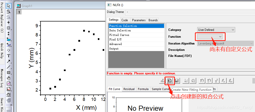 由于我们第一次使用自定义拟合,因此暂无自己设定的拟合函数,需要先创建一个拟合公式。如下图,点击创建新拟合公式按钮进行创建。