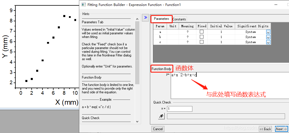 由于我们打算使用y=ax²+bx+c这样的一元二次方程,因而,需要将Parameters变量改为三个,即a,b,c,然后继续点击下一步。