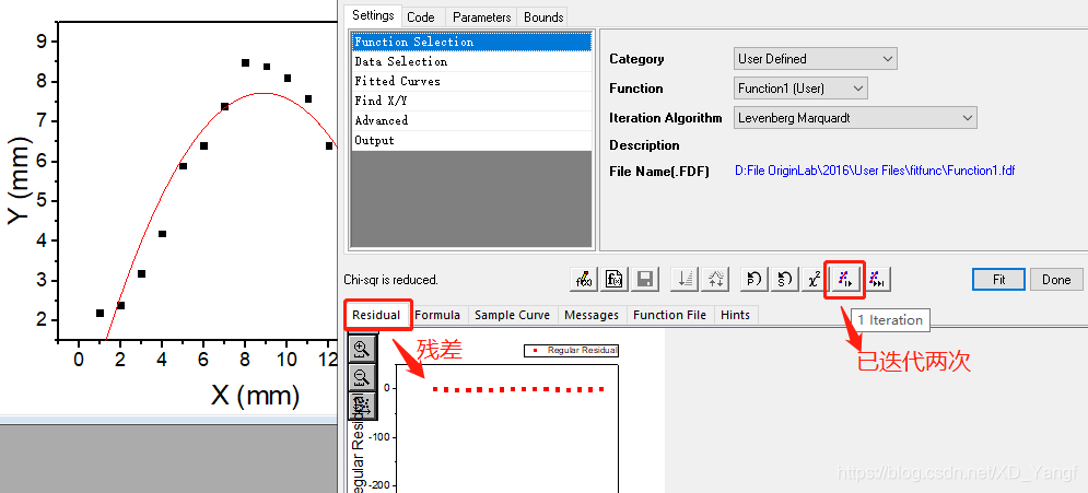 和前面一样,多次点击1 Iteration单次迭代,可观察曲线拟合的过程。下图中,在Residual信息分页,可以看到拟合过程中的残差值变化。