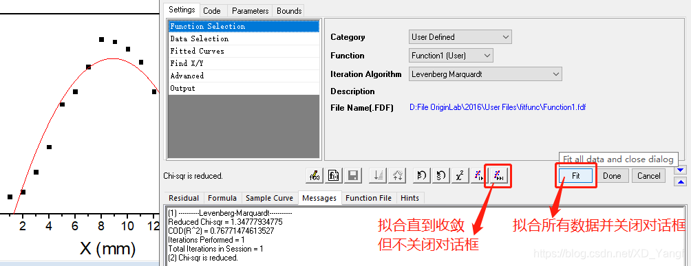接着,点击拟合直到收敛,或是Fit按钮,都可以完成拟合。那么这两个按钮的区别是,拟合直到收敛点击后不会关闭当前对话框,而Fit点击后会完成拟合并关闭当前对话框。
