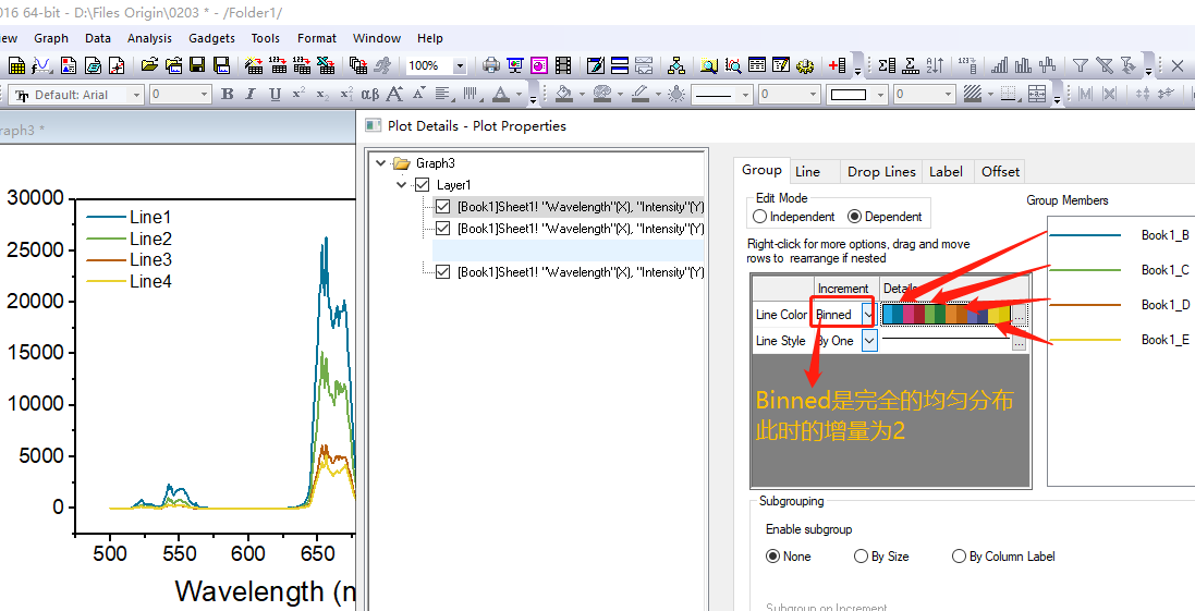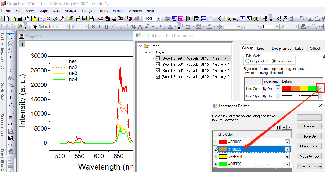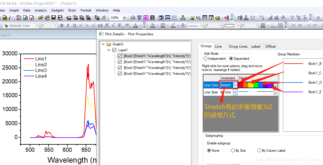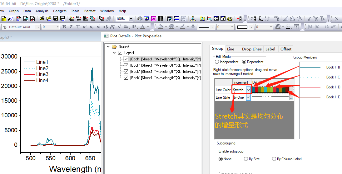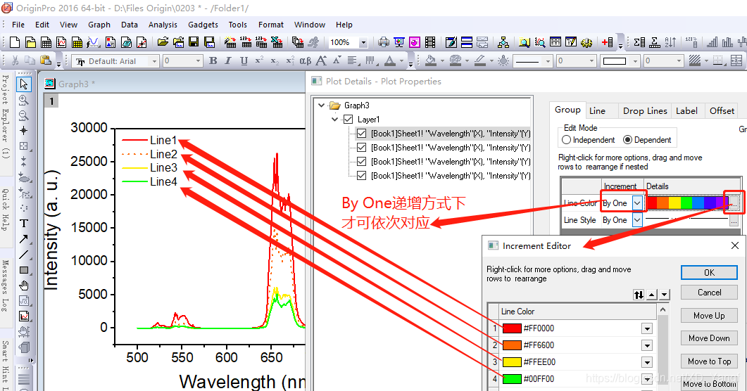接下来,我们回想一下前面我提到的一个词:颜色递增。现在,我们看Line Color后面那列,名称是Increment。经常阅读文献的同学,应该能意识到,这个词的意思是增量,因而,跟多个数据的变化相关。那么,打开下拉箭头,发现Increment的类型有By One,Stretch,Binned。经过测试发现,By One就是逐个增加的意思,大家可以理解为增量为1的线性递增。因此,在左侧Layer1下的数据依然不能任意选择的情况下下,在By One的形势下,通过依次设置多个色块的颜色,就可以在Dependent的状态下实现对单个线条更改颜色。