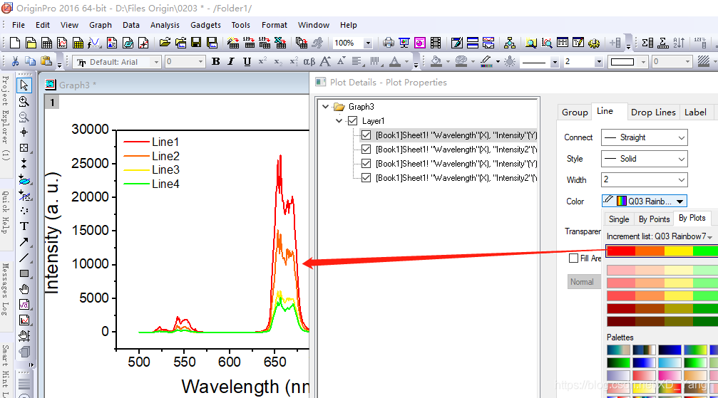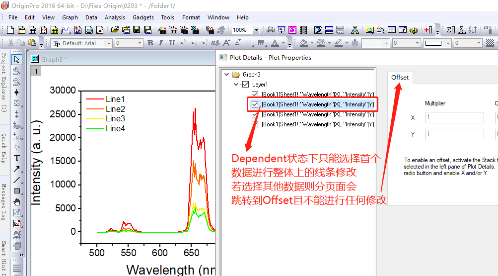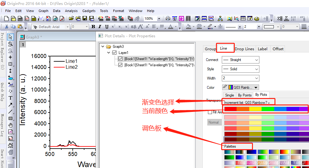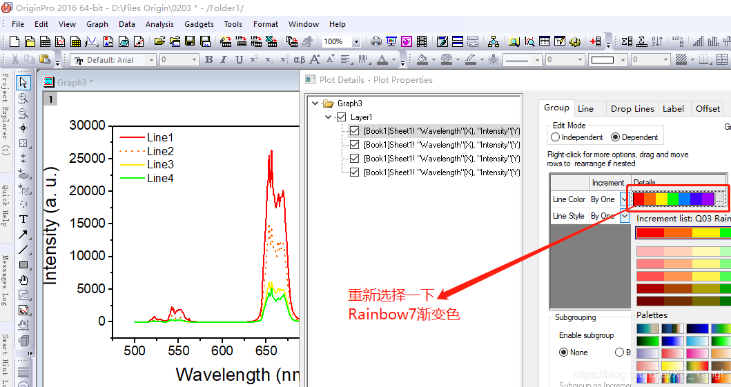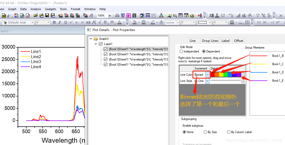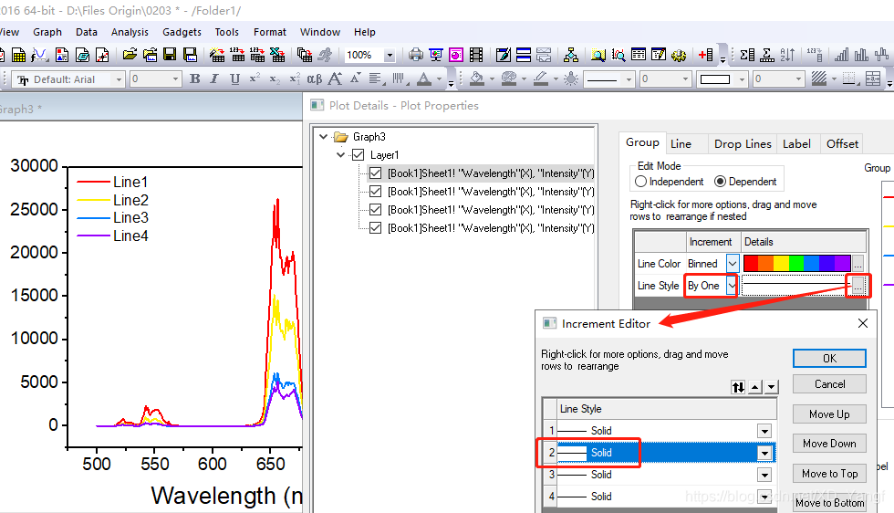 接下来,我们回想一下前面我提到的一个词:颜色递增。现在,我们看Line Color后面那列,名称是Increment。经常阅读文献的同学,应该能意识到,这个词的意思是增量,因而,跟多个数据的变化相关。那么,打开下拉箭头,发现Increment的类型有By One,Stretch,Binned。经过测试发现,By One就是逐个增加的意思,大家可以理解为增量为1的线性递增。因此,在左侧Layer1下的数据依然不能任意选择的情况下下,在By One的形势下,通过依次设置多个色块的颜色,就可以在Dependent的状态下实现对单个线条更改颜色。