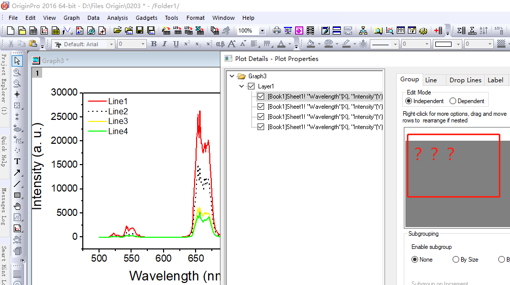 如果要单独更改某个线条的颜色,就需要回到Group分页中,将编辑模式改为Independent独立模式。然后再回到Line分页,这时,对颜色的选择都变成了单色块了。同时,与Independent状态下不同的是,此时我们选择左侧Layer1中的单个数据,是可以开始对单个线条进行修改的。下图中,我们将Line2第二个线条的颜色改为了黑色。