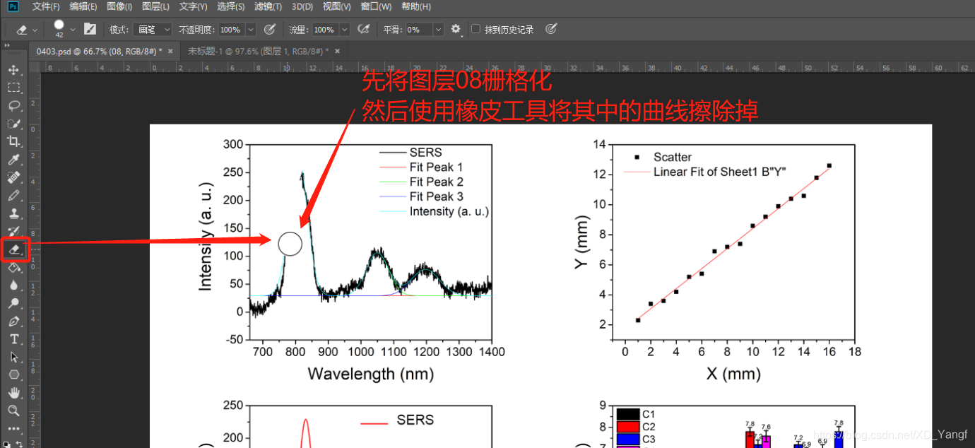 为了介绍索套工具,我们这里准备将082图层中的曲线线条框选出来,并移动到图层08中将其中的所有曲线覆盖。在这之前,需要先使用到橡皮擦工具将已栅格化图层08中的曲线擦除掉。橡皮擦的使用方式非常简单,直接点击拖拽即可擦除图片内容。