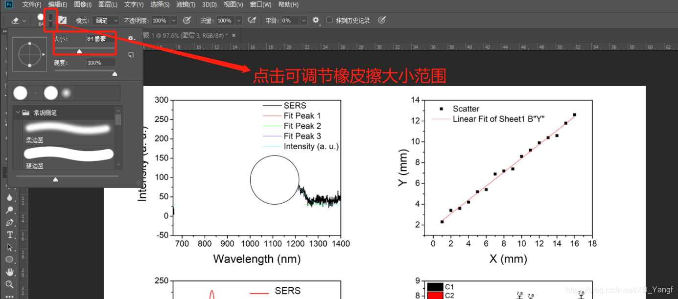 同时,在橡皮擦模式下,点击下图中工具栏红框处的下拉箭头,可以调节橡皮擦的范围大小。