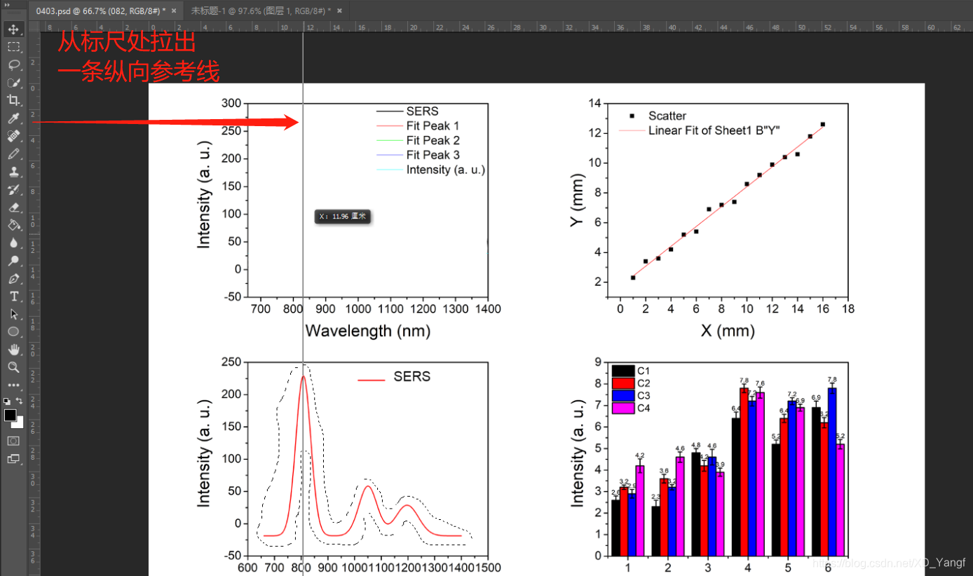 为了使曲线在移动过程中不会横向偏移得太厉害,可以使用像在Visio中介绍到的参考线。在PS中,拖出参考线的方法,同样是从标尺处,点击并向右拖拽,即可拖出一个纵向参考线,并拖至曲线峰值处。