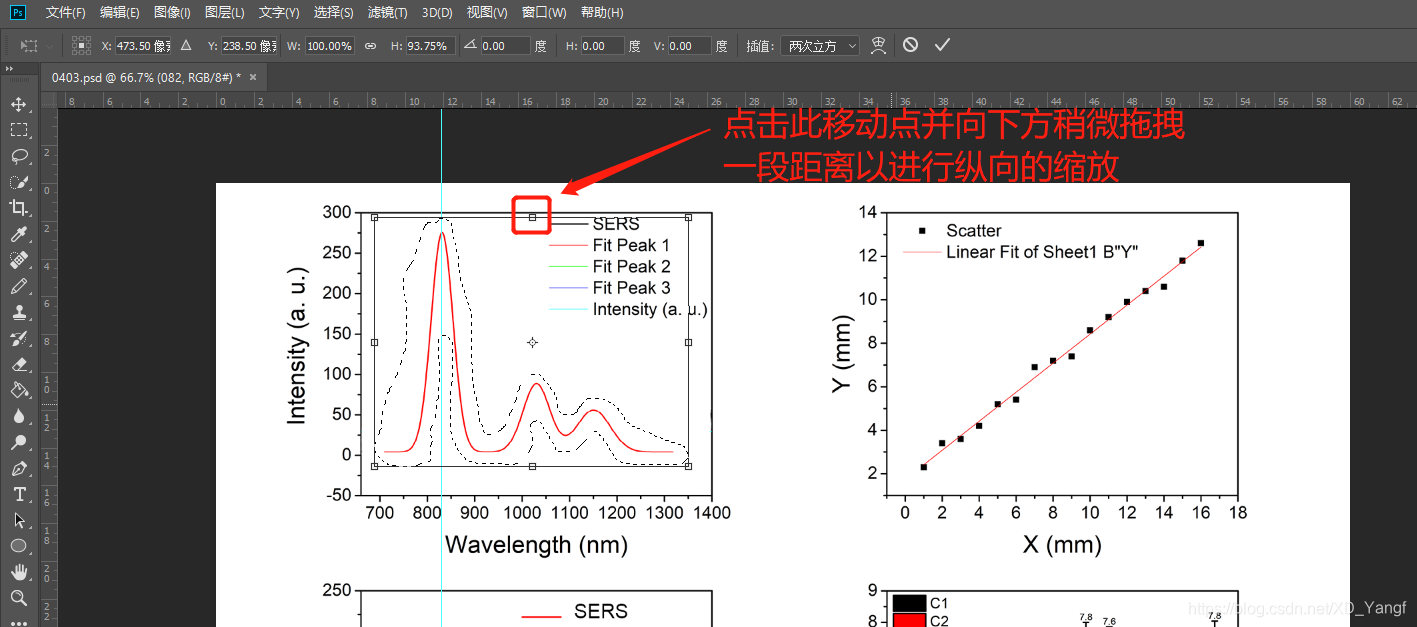 如下图所示,使用移动工具,已将曲线移动到图层08中的图框中,但上方仍超出了边框。因而,在框选需要调整的图片局部的时候,尽量框选出需要部分占比比较高的选区,即留白尽量少。同时,08图层和082图层中的纵坐标范围不一致,因此,需要对刚刚移动的选区图形进行纵向的缩放。