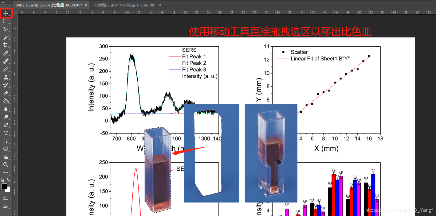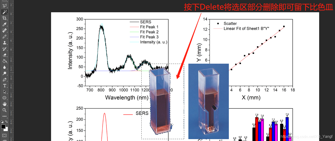 保持选区存在的状态下,适当地缩放比色皿,并移动到合适位置。同时,可使用矩形选框工具,框选扣除比色皿后的剩余图片,并点击Delete将其删除。