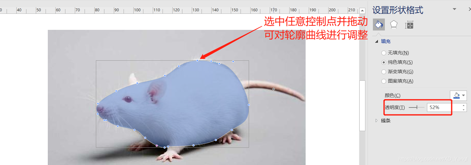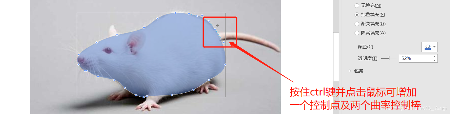 如下图所示,给图形增加了透明度之后,调整控制点会比较容易判断曲线变化后和原图的接近度。