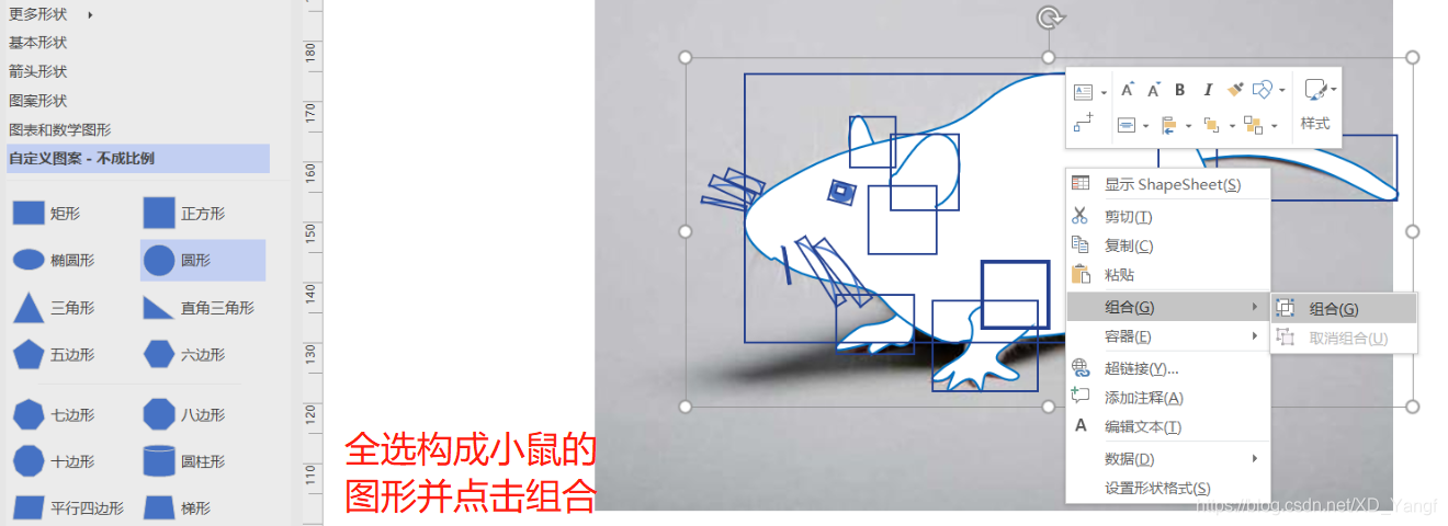 接下来,我们准备给小鼠添加阴影效果。在这之前,需要先将小鼠的所有图形部分组合在一起才行。