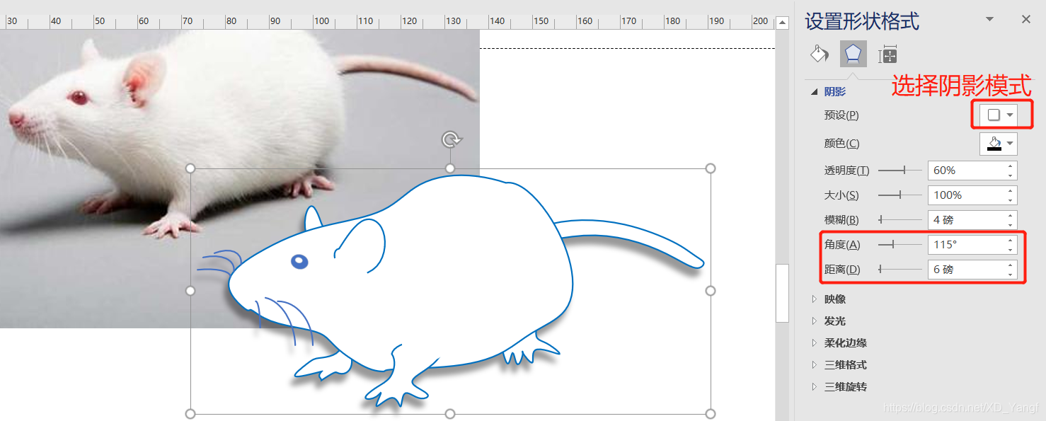 接着,在设置形状格式中,选择效果分页,并从阴影预设中选择一种阴影模式以添加阴影效果(这里我选择了偏移:左下的模式)。如下图所示,在细节方面,可以根据需求自主调节一些参数,我这里只调节了阴影的角度和距离。