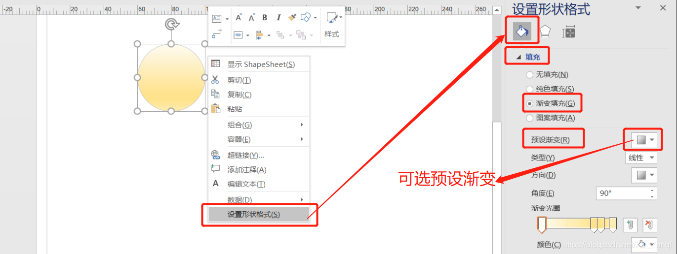 再添加渐变色,可选择Visio自带的预设渐变,或是自己调节渐变光圈选择颜色。