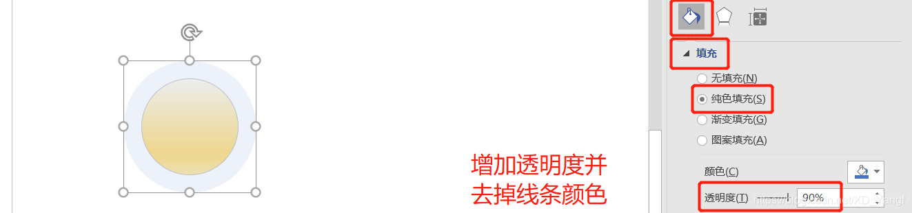接着,给当前圆形增加透明度至90%(视情况而定),可做出NaYF4外围有一层SiO2层的效果,同时,可以去掉当前圆形的线条颜色。