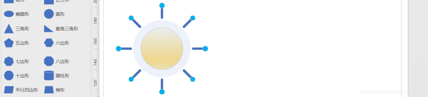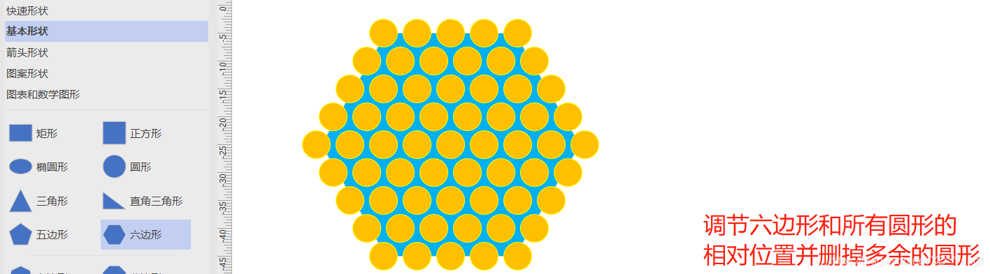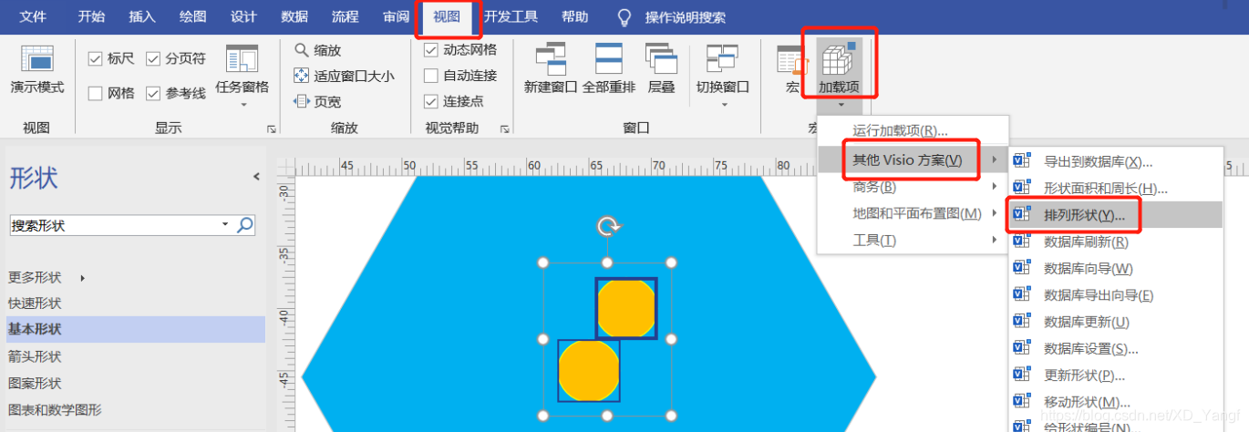 此时,可将上一步中的小六边形删掉,然后同时选中两个圆形。接着,选择视图菜单,并点击加载项——》其他Visio方案——》排列形状,以打开排列形状面板。