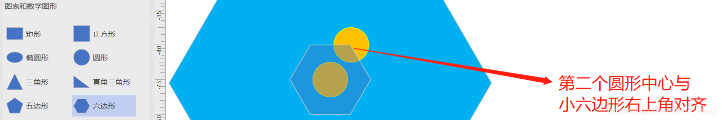 再创建一个小六边形,放置于大六边形的中心,同时增加其透明度,并将另外一个圆形移动至小六边形的右上角,使圆心与此角对齐。