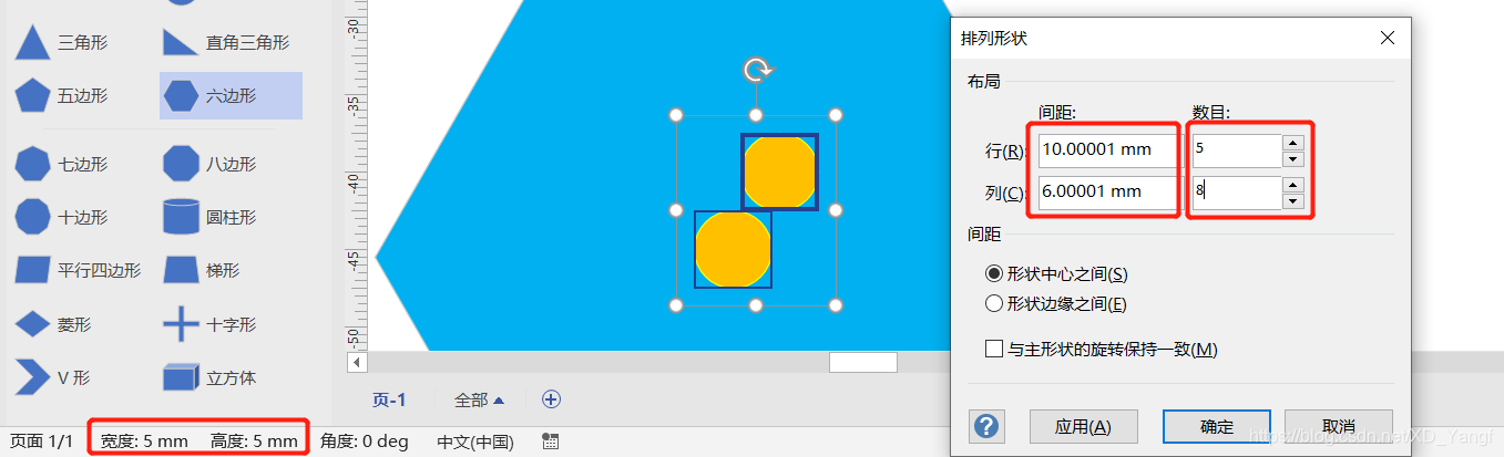 调整行列间距至合适的值(这需要大家根据结果多次调整,方可知道合适的行列间距),比如,我这里的圆形参数为5 mm* 5 mm,则行列间距可分别设为10和6 mm。而排列的数目,大家也可根据具体情况调节。
