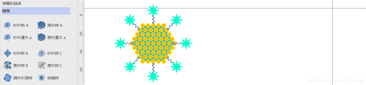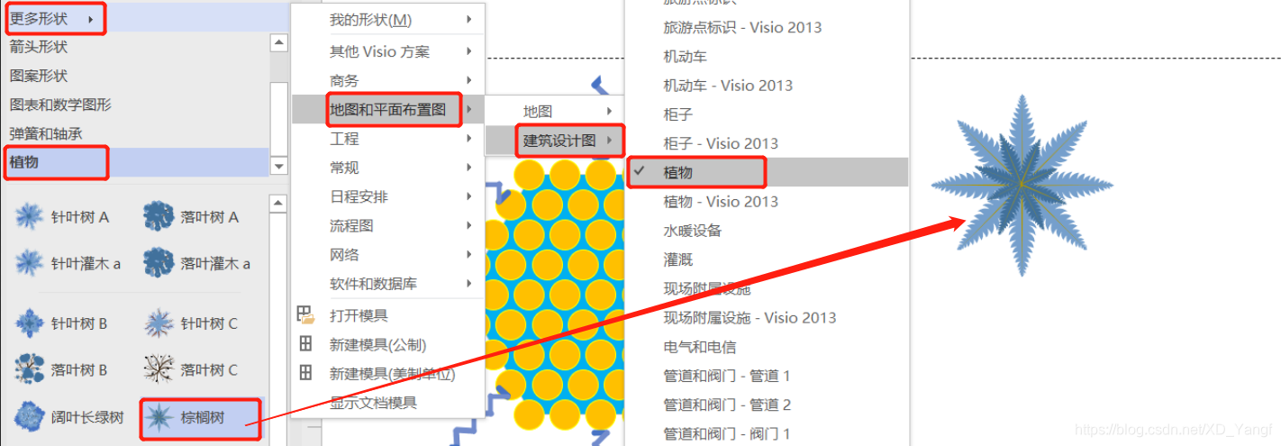 这次我们找个新的图形,来绘制FA叶酸。点击更多形状——》地图和平面布置图——》建筑设计图——》植物,以打开植物图库,并从中创建一个棕榈树。