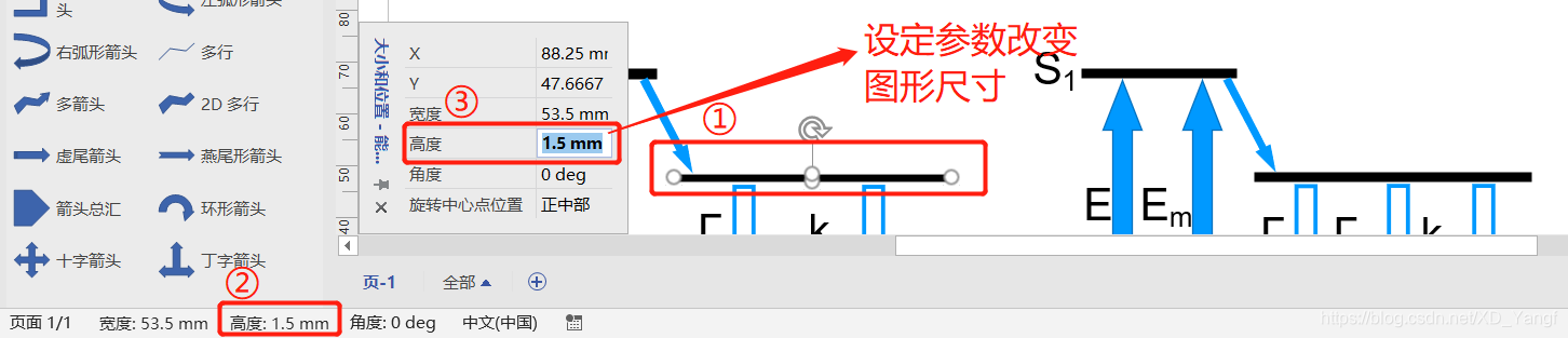 将所有的能级矩形高度都调整为1.5 mm,如下图。这里有一个技巧,对于很多Office软件来说,F4键都可以实现上一步操作。因此,当我们以这种修改参数的形式修改了一个矩形之后,接着,依次选中其他矩形并按下F4,即可方便、快捷地修改所有矩形的高度。