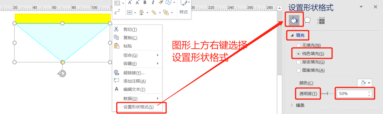 在棱镜上方右键,点击设置形状格式,在填充中可以给图形增加一些透明度,以体现镜子的特性。