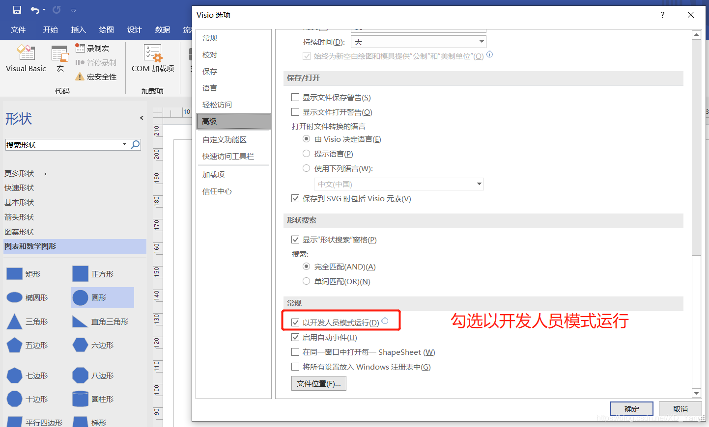 接下来,需要开启一个开发人员模式。点击菜单栏的文件,然后点击选项,会弹出下图中的Visio选项对话框。然后下拉,找到以开发人员模式运行,并将其勾选,点击确定退出。