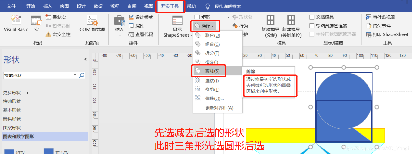 剪除的前提有两个,一是必须同时框选两个图形,二是剪除过程必须是先选的图形减去后选的图形。如下图所示,我们准备用三角形去剪除圆形与其重叠的部分,因而,圆形需要先选,然后按住ctrl键再选择三角形。框选了两个图形之后,点击开发工具中的操作——》剪除,即可完成剪除。