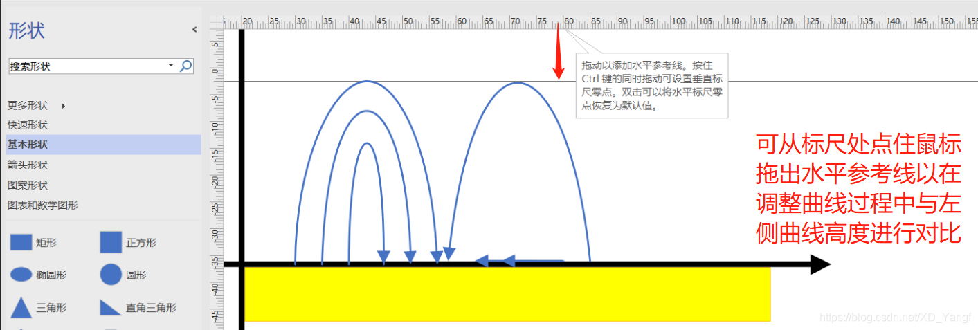 可从标尺处点住鼠标左键,以拖出水平参考线至左侧曲线高度位置,这样可以辅助调整新的曲线的高度和弯曲度。