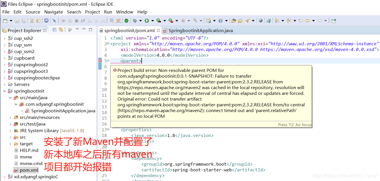 项目生成错误:对于com.xdyangf:springbootinit:0.0.1-SNAPSHOT存在不可解析的父项目对象模型POM:未能将已缓存在本地存储库中的org.springframework.boot:spring-boot-starter-parent:pom:2.3.2.RELEASE从https://repo.maven.apache.org/maven2传输,在中心(中心可能指的是maven源)的更新间隔时间超出或强制执行更新之前,不会重新尝试解析。原始错误:无法将项目Original error: Could not transfer artifact org.springframework.boot:spring-boot-starter-parent:pom:2.3.2.RELEASE从/到中心(https://repo.maven.apache.org/maven2)传输:连接超时,并且'parent.relativePath'指向没有本地POM。