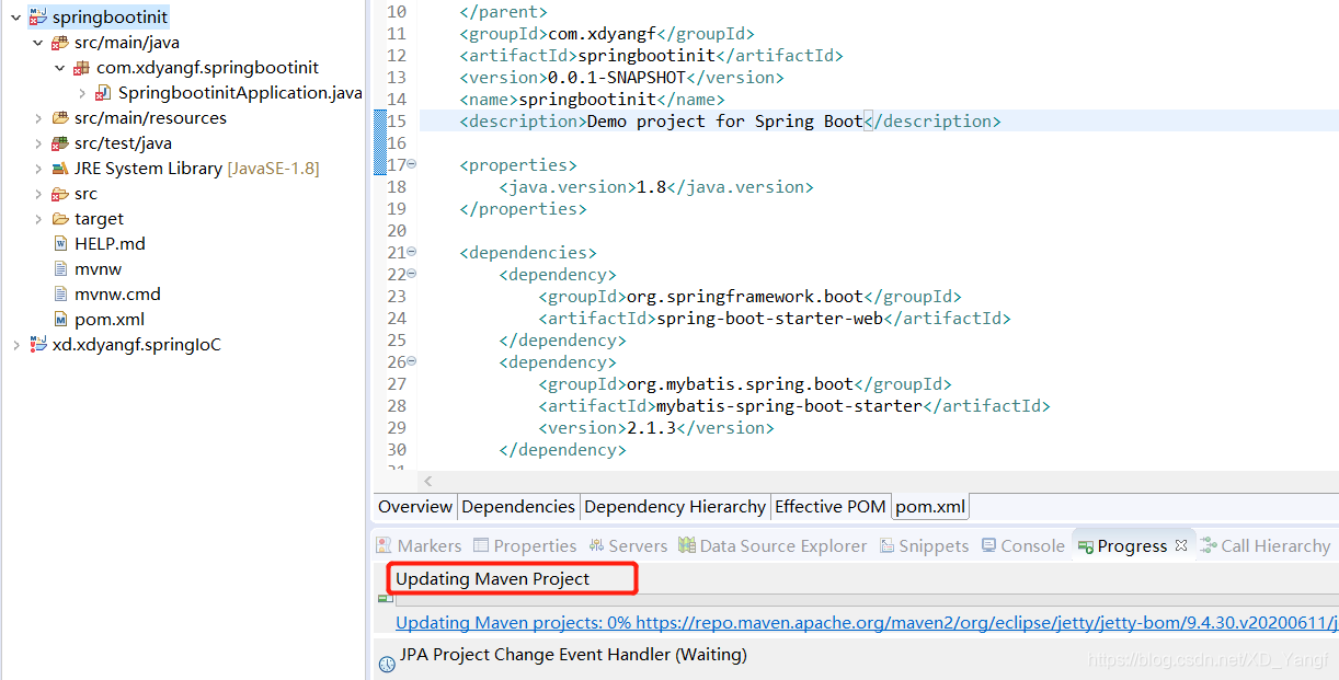 如下图所示,当springbootinit项目中所需的所有Maven依赖都正常下载之后,项目将不再报错。Eclipse资源管理器中的其他SpringBoot依然有爆红是因为,还没有对这些项目进行Maven更新,更新之后,也将恢复正常。