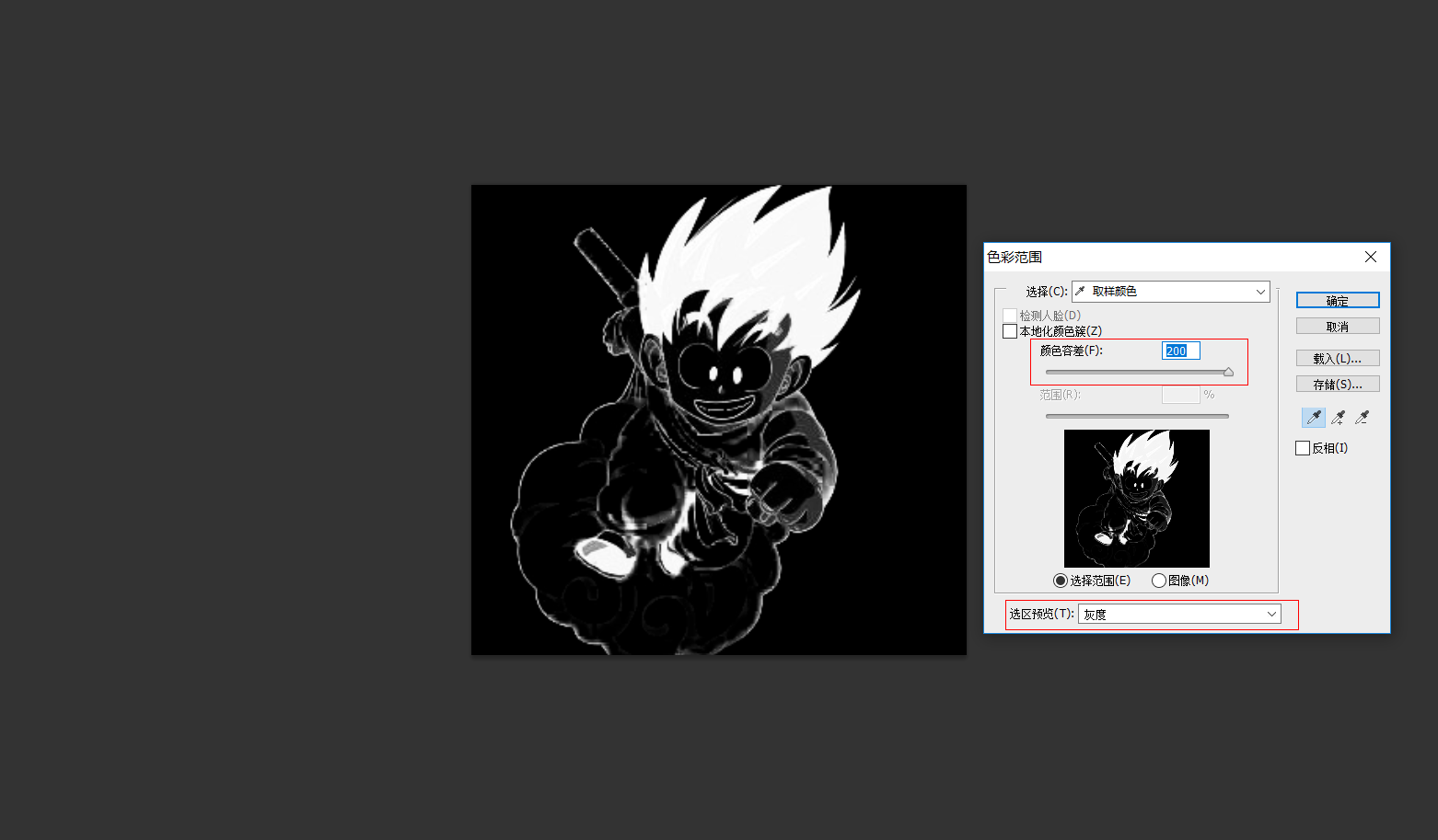 3、色彩范围中去修改:颜色容量、选取预览,让图片要变色的局部为白色,确定;