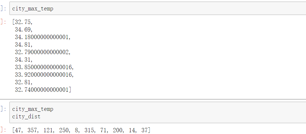 city_max_temp = [] city_dist = [] city_list = [ferrara,torino,mantova,milano,ravenna,asti,bologna,piacenza,cesena,faenza] for city in city_list: temp = city['temp'].max() dist = city['dist'].max() #获取其中一个值(即可) city_max_temp.append(temp) city_dist.append(dist)