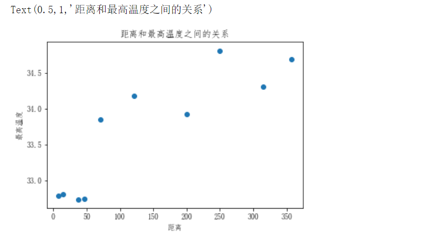 plt.scatter(city_dist,city_max_temp) plt.xlabel('距离') plt.ylabel('最高温度') plt.title('距离和最高温度之间的关系')