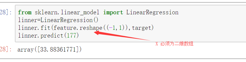 from sklearn.linear_model import LinearRegression #实例化算法模型对象 linner = LinearRegression() # y = wx + b #训练模型 #X:二维的特征数据 #y:目标数据 linner.fit(feature.reshape((-1,1)),target) #预测 # 一个数据 linner.predict(177) # 两个数据 linner.predict([[175],[201]])
