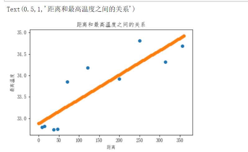 plt.scatter(city_dist,city_max_temp) plt.scatter(x,y) plt.xlabel('距离') plt.ylabel('最高温度') plt.title('距离和最高温度之间的关系')